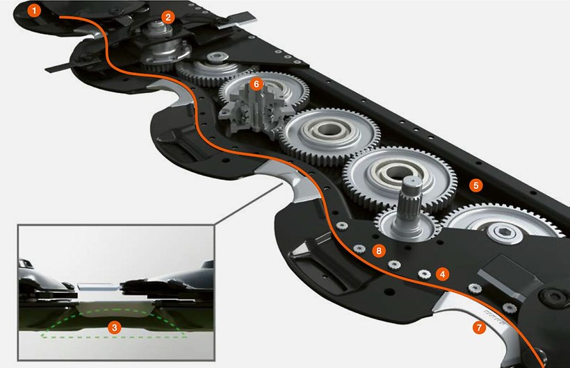 Les pignons satellites perfectionnés combinent les avantages de différents systèmes d'entraînement et confèrent au lamier une efficacité inégalée. Du fait de la forme spéciale du lamier, les pignons satellites de grandes dimensions sont très avancés et s'emboîtent en deux points. L'espacement régulier des disques assure une coupe parfaite dans toutes les conditions de récolte. L'usage exclusif de matériaux de grande qualité garantit une durée de vie maximale. Le lamier MAX CUT est graissé à vie et ne requiert donc aucun entretien.